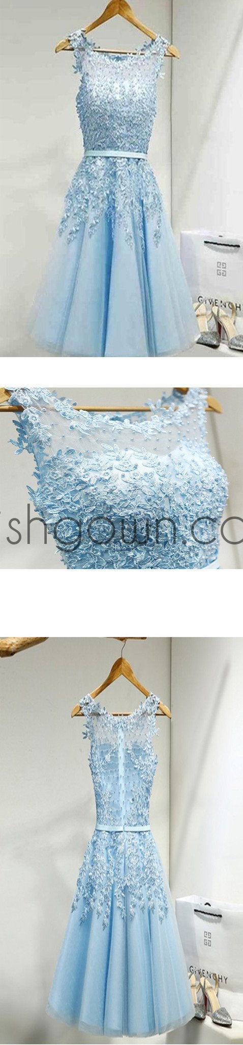 Light blue appliques lace see through lovely freshman homecoming prom gown dress,BD00109