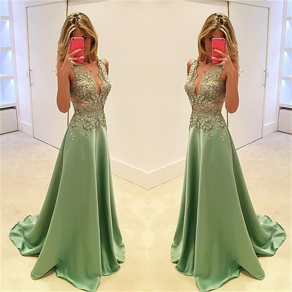 Deep V-Neck Stunning A-line Sexy Fashion Green Evening Long Prom Dress, PD0160