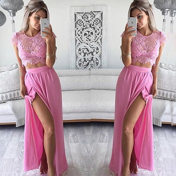 Pink Lace Two Pieces Short Sleeve Sexy Side Slit Long Prom Dress, WG729