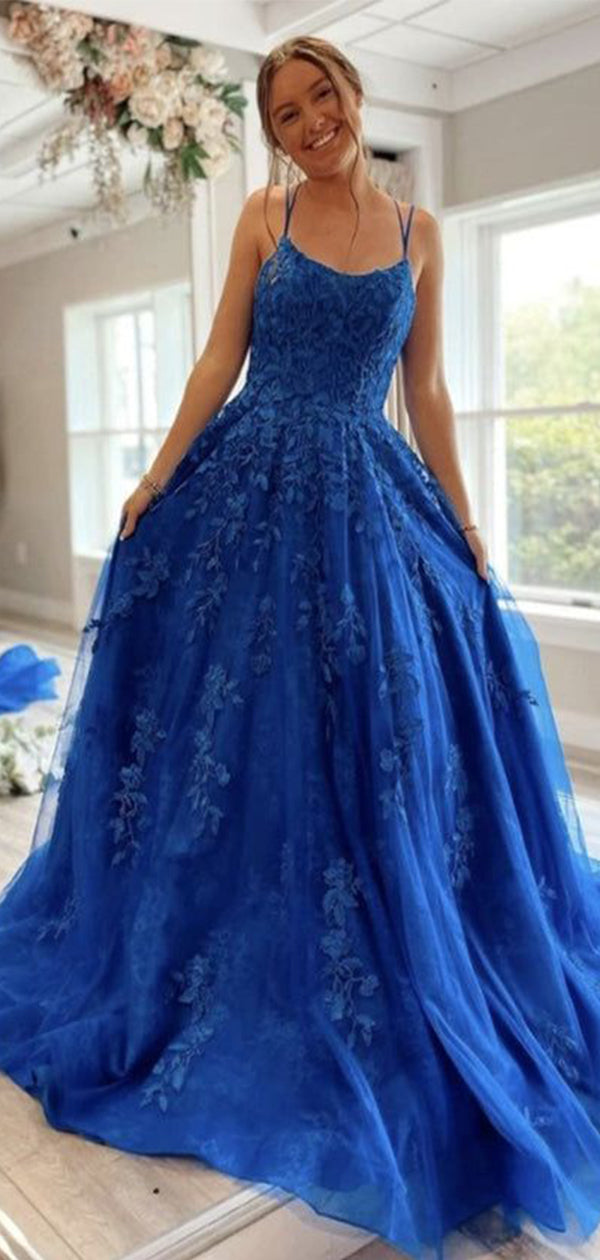 Elegant Blue A-Line Spaghetti Strap Lace Popular Long Evening Dresses, Formal Dresses, Birthday Party, WGP584
