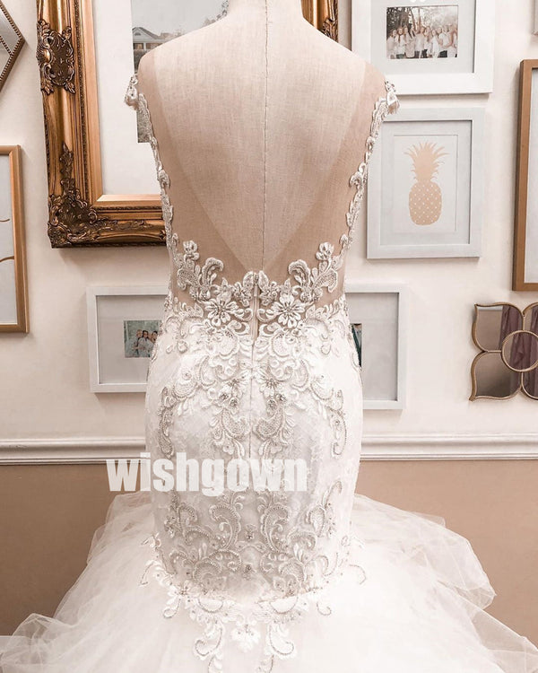 Elegant Cap Sleeve Mermaid Tulle Long Wedding Dresses WDH014