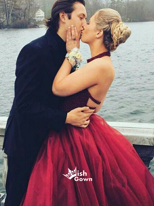 Burgundy A-line Tulle Sparkly Sequins Halter Top Long Wedding Party Prom Dress, WGP092