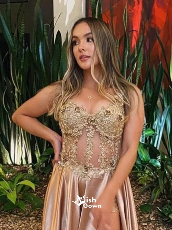 Glod Strapless Appliques Sweetheart Soft Satin A-line Evening Gowns Prom Dresses, WGP199