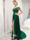 Green Lace Off Shoulder Appliques Slits A-line Evening Gowns Prom Dresses , WGP161