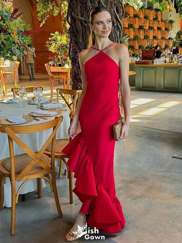 Sexy Red Halter Straps Ruffle Sexy Slits Evening Gowns Prom Dresses, WGP231