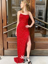 Red Sequins Spaghetti Straps Slits Tassels Backless Sheath Long Prom Dresses Party Gowns, WGP213
