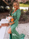 Two Piece Slit Sequins Long Sleeve V-neck Lace Up Mermaid Long Prom Dresses , WGP115