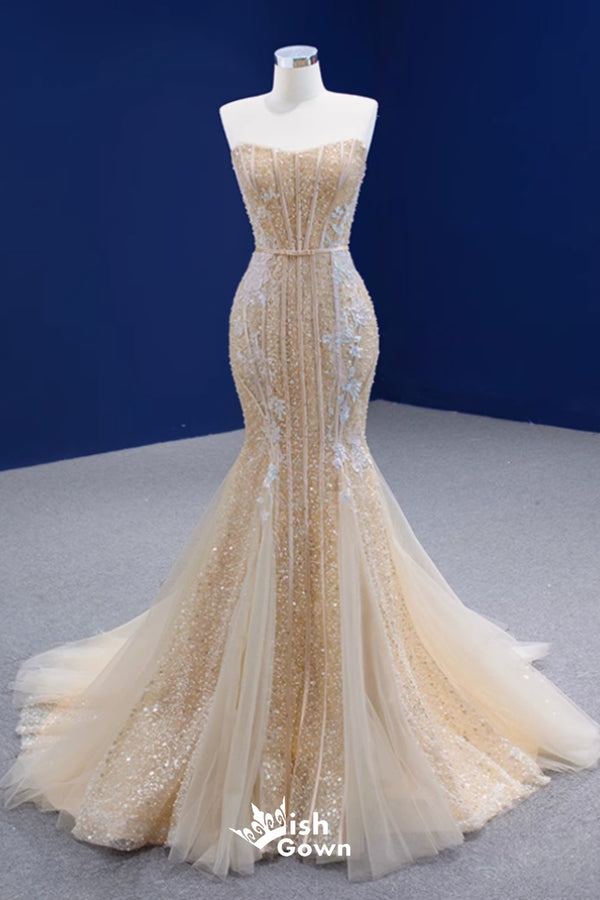 Shiny Champagne Strapless Lace Appliques Mermaid Long Party Dress Prom Dresses,Evening Dress Online, WGP942