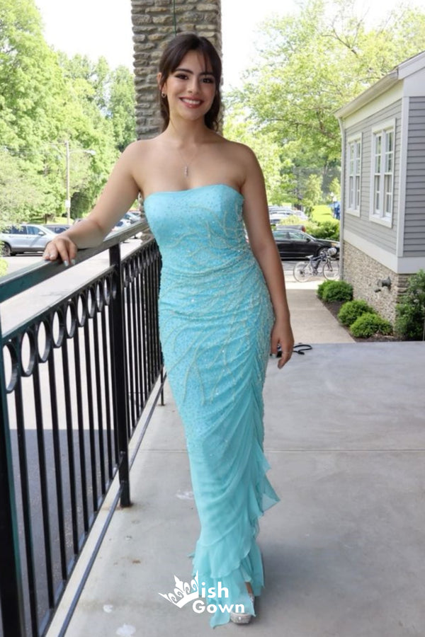 Stylish Light Blue Strapless Straight Neck Mermaid Long Party Dress Prom Dresses,Evening Dress Online, WGP909