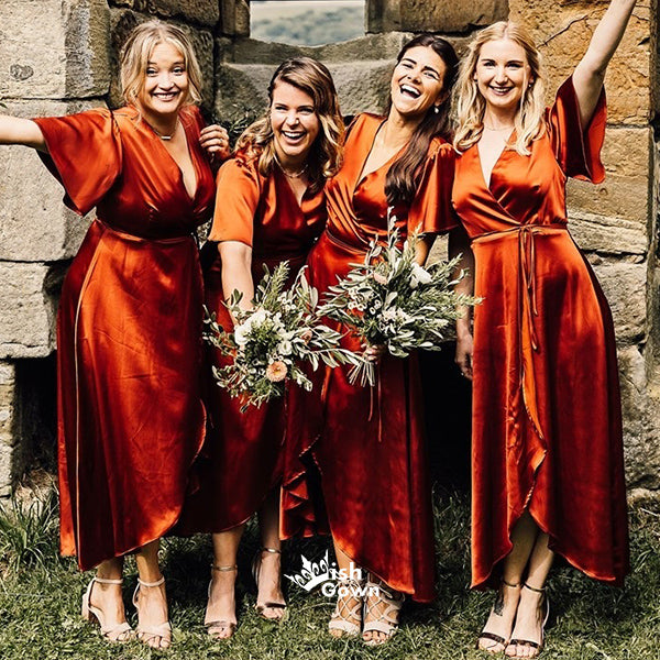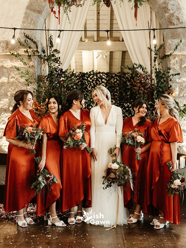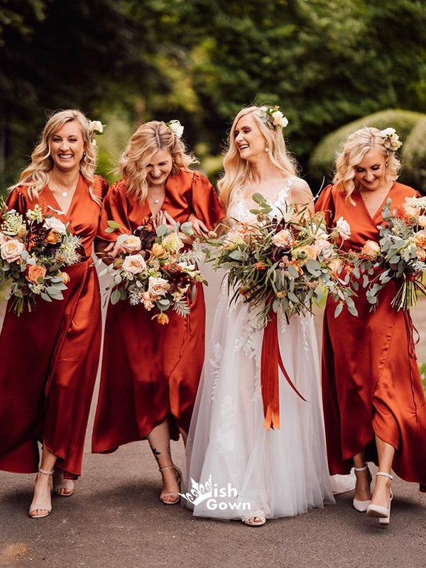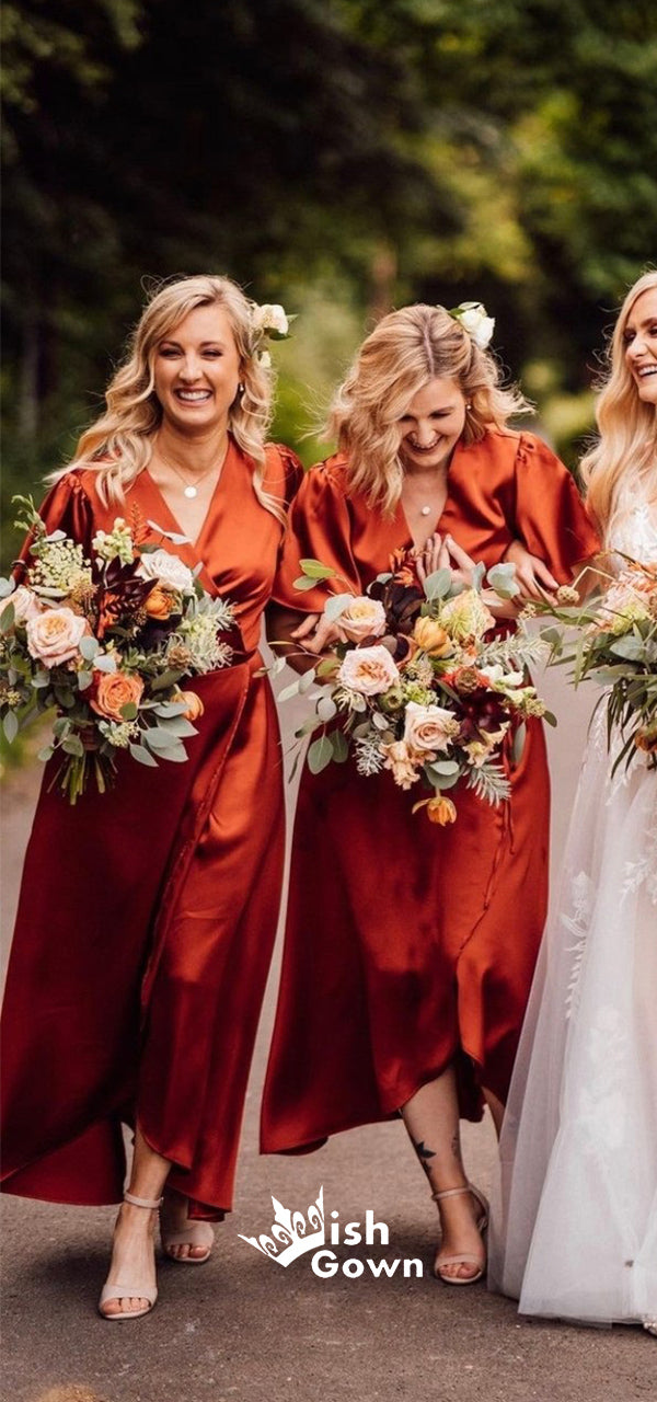 Soft Satin V-neck Short Sleeves Lace-Up High-Low Maxi Bridesmaid Dresses, WGM092