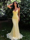 Elegant Yellow Spaghetti Straps V-Neck Memaid Long Prom Dress Ideas, Evening Party Dresses,WGP1857
