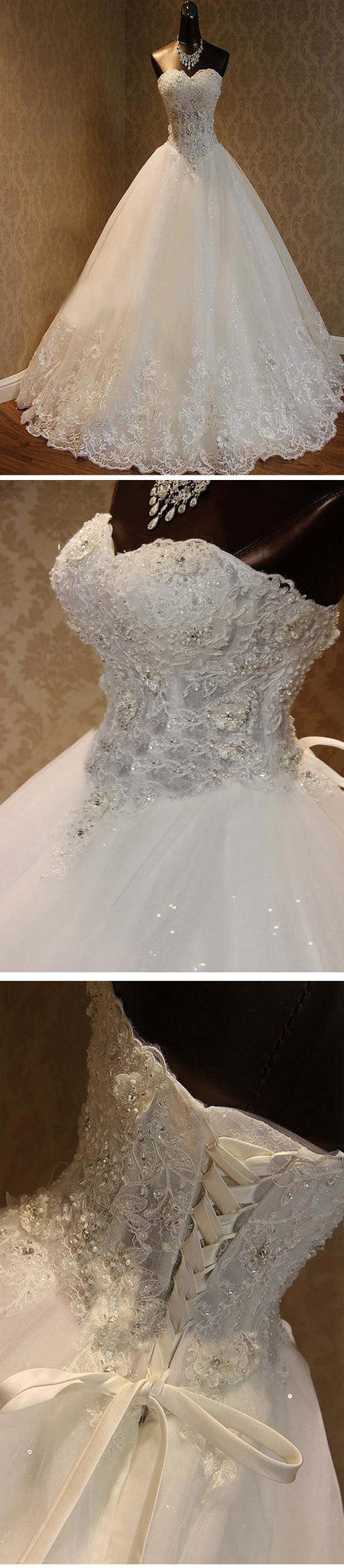 Luxury Sweetheart Rhinestone Beaded White Lace Wedding Dresses, Tulle Bridal Gown, WD0025